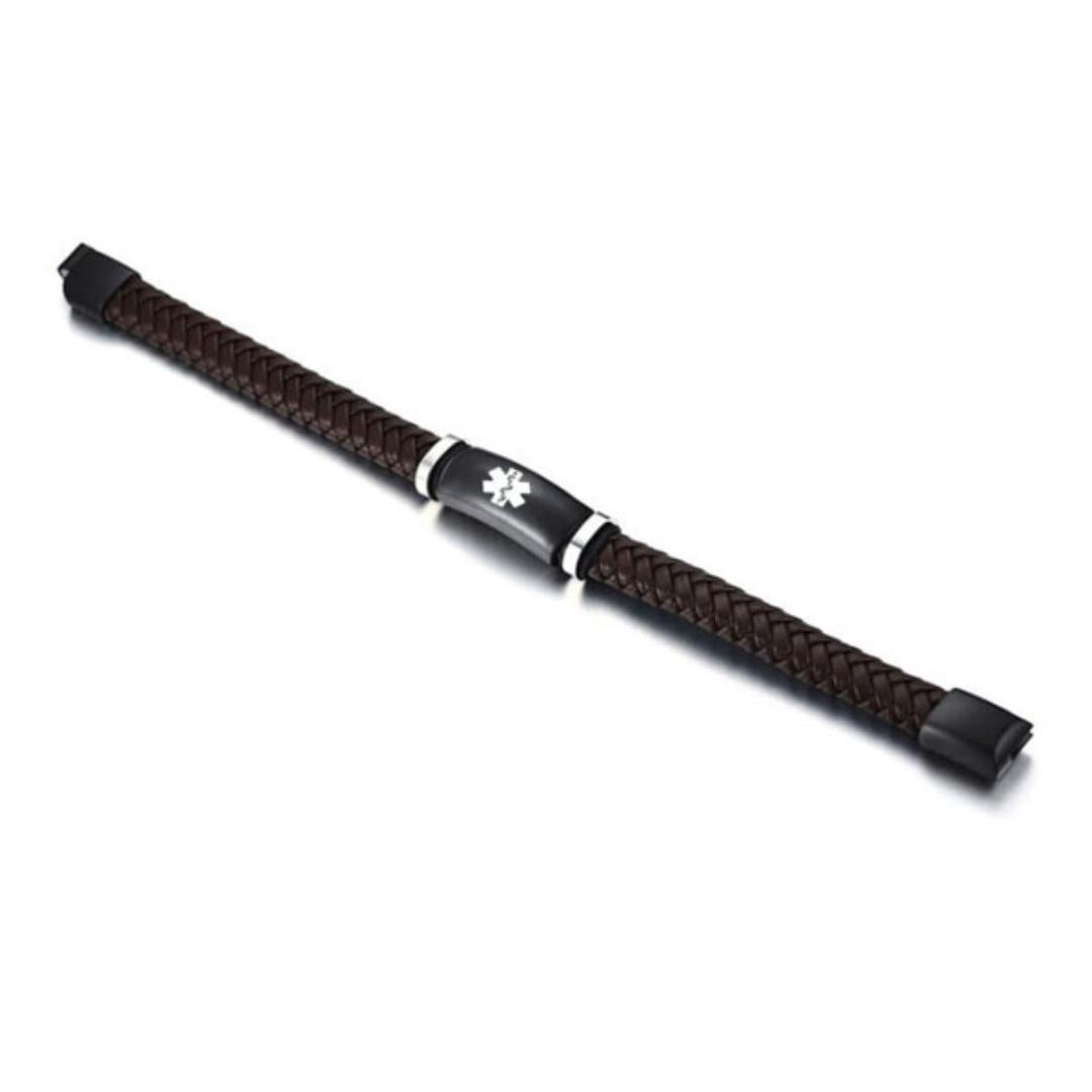 leek, tough and brilliantly understated, our Braided Leather Medical ID Bracelet combines a woven micro-fibre leather band with a matte-black stainless-steel plate. The Star of Life symbol on the front alerts first-responders in seconds, while your critical details are laser-engraved discreetly on the back. Available in classic Black or rich Brown and cut in one fuss-free 21 cm size, it slips on with a secure magnetic clasp for everyday wear.