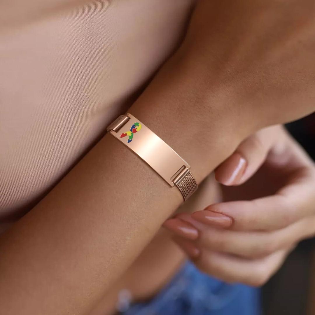This stunning rose gold mesh medical ID bracelet features a colourful puzzle ribbon symbol, commonly associated with autism awareness and broader support causes. Crafted from IP rose gold plated stainless steel, it’s designed for durability, comfort, and everyday elegance.