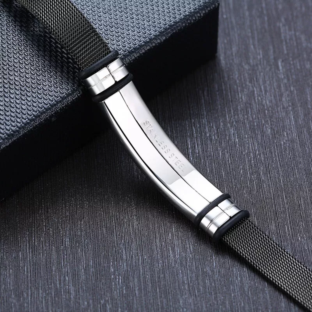 Combining a bold black mesh band with a high-polish silver plate, this custom medical alert bracelet delivers both visibility and modern edge.