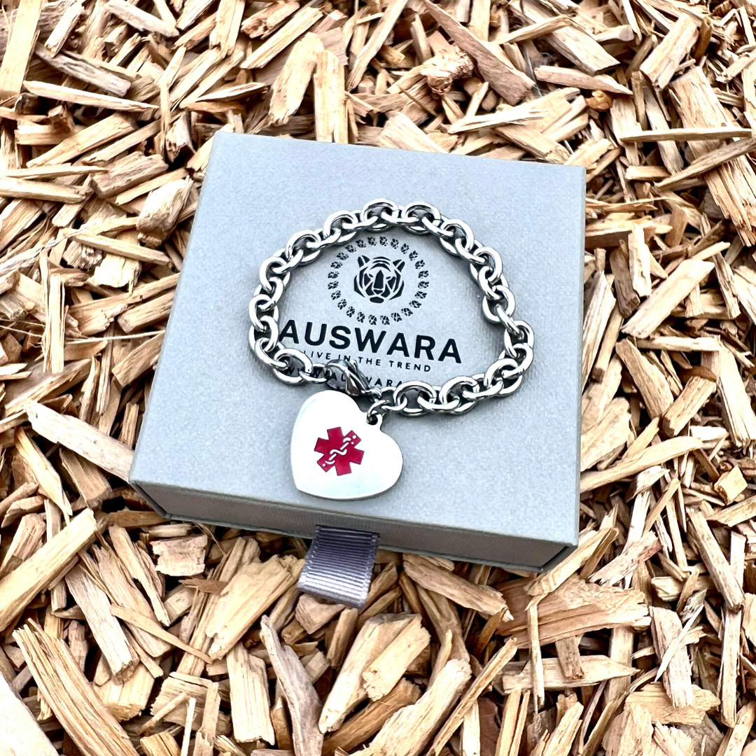 Stay safe and stylish with this elegant Chains Bracelet with Heart Charm Medical ID, designed specifically for women. Crafted from durable stainless steel, this bracelet features a classic chain-style design that pairs beautifully with any outfit. The standout feature is its heart-shaped charm, adorned with a striking red medical logo, ensuring your medical needs are easily identifiable in an emergency.