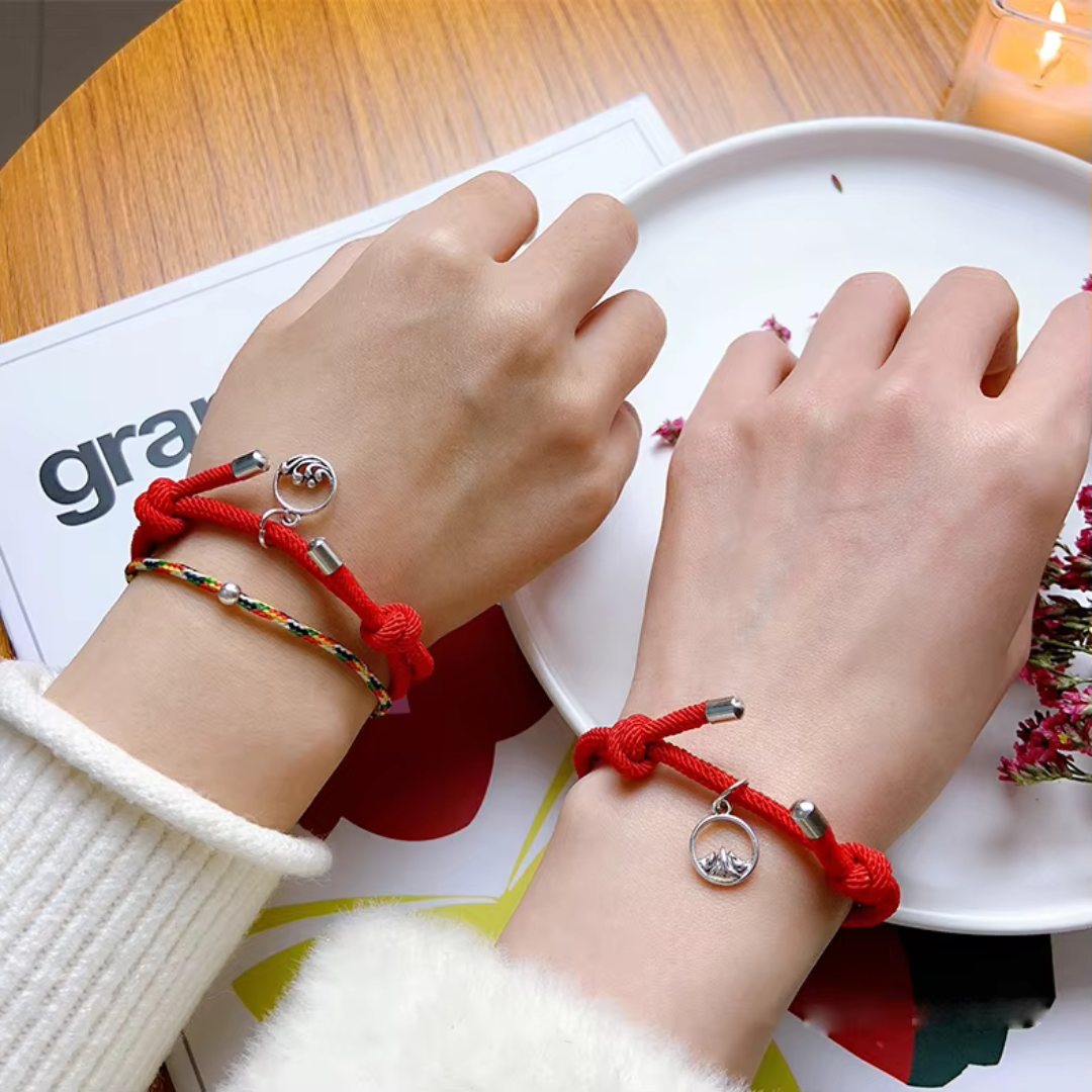 These matching bracelets showcase mountain and ocean charms, representing the timeless bond of eternal love. Each bracelet features a magnetic bell that attracts its pair, linking them together whenever they're near. Fully adjustable, these bracelets ensure the perfect fit for any wrist.